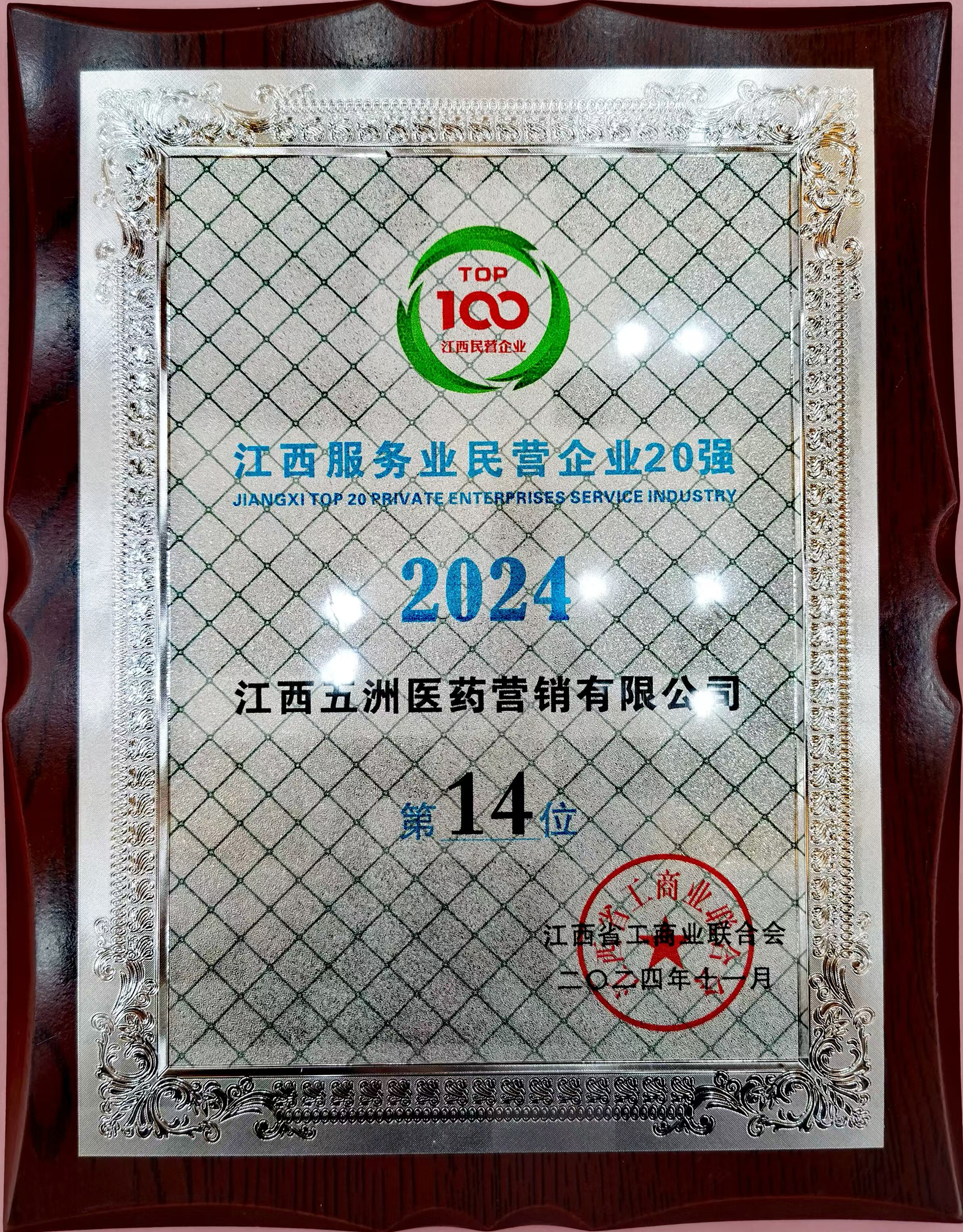 五洲醫(yī)藥榮獲“江西服務(wù)業(yè)民營企業(yè)20強第14位”榮譽稱號。