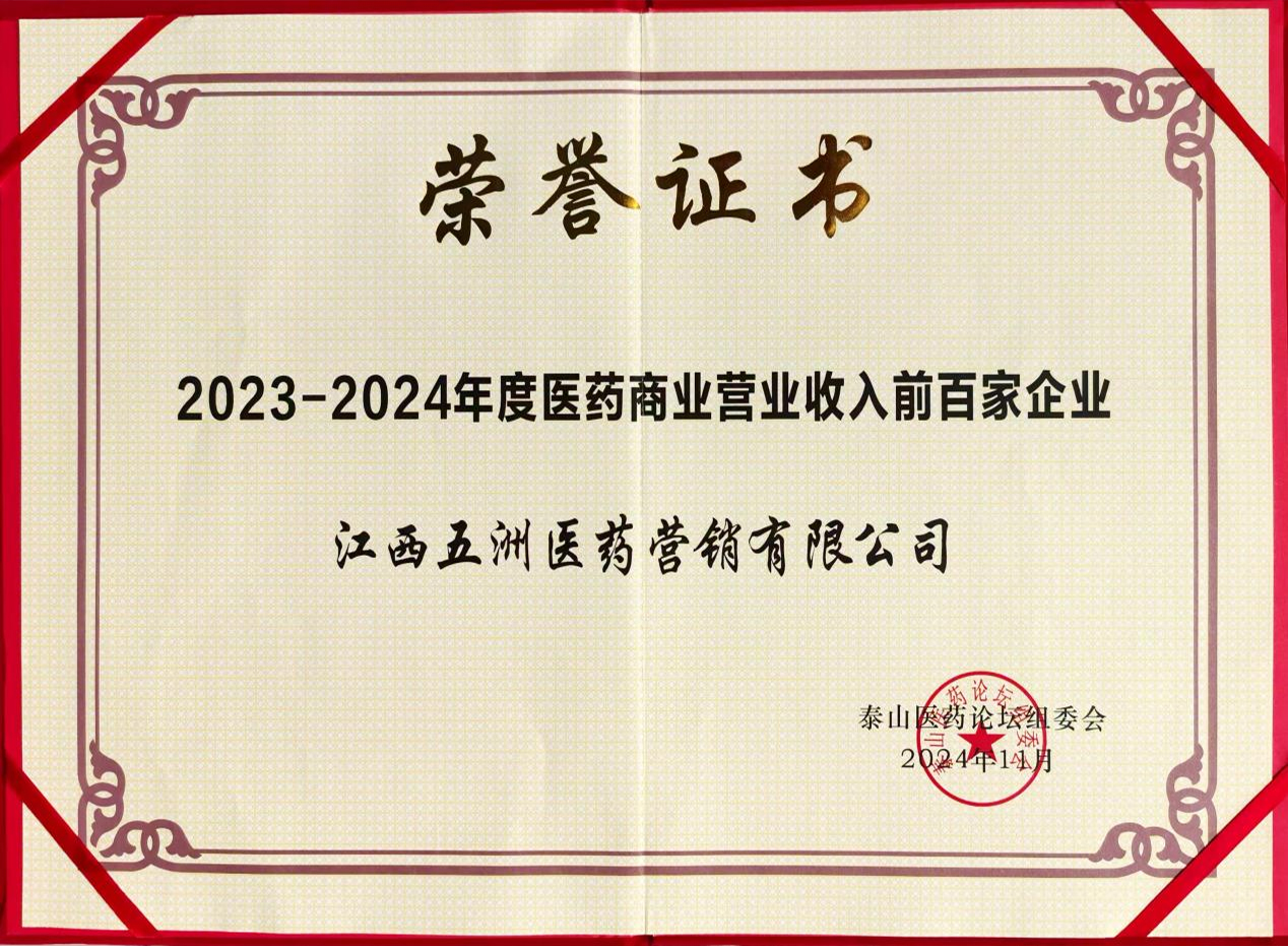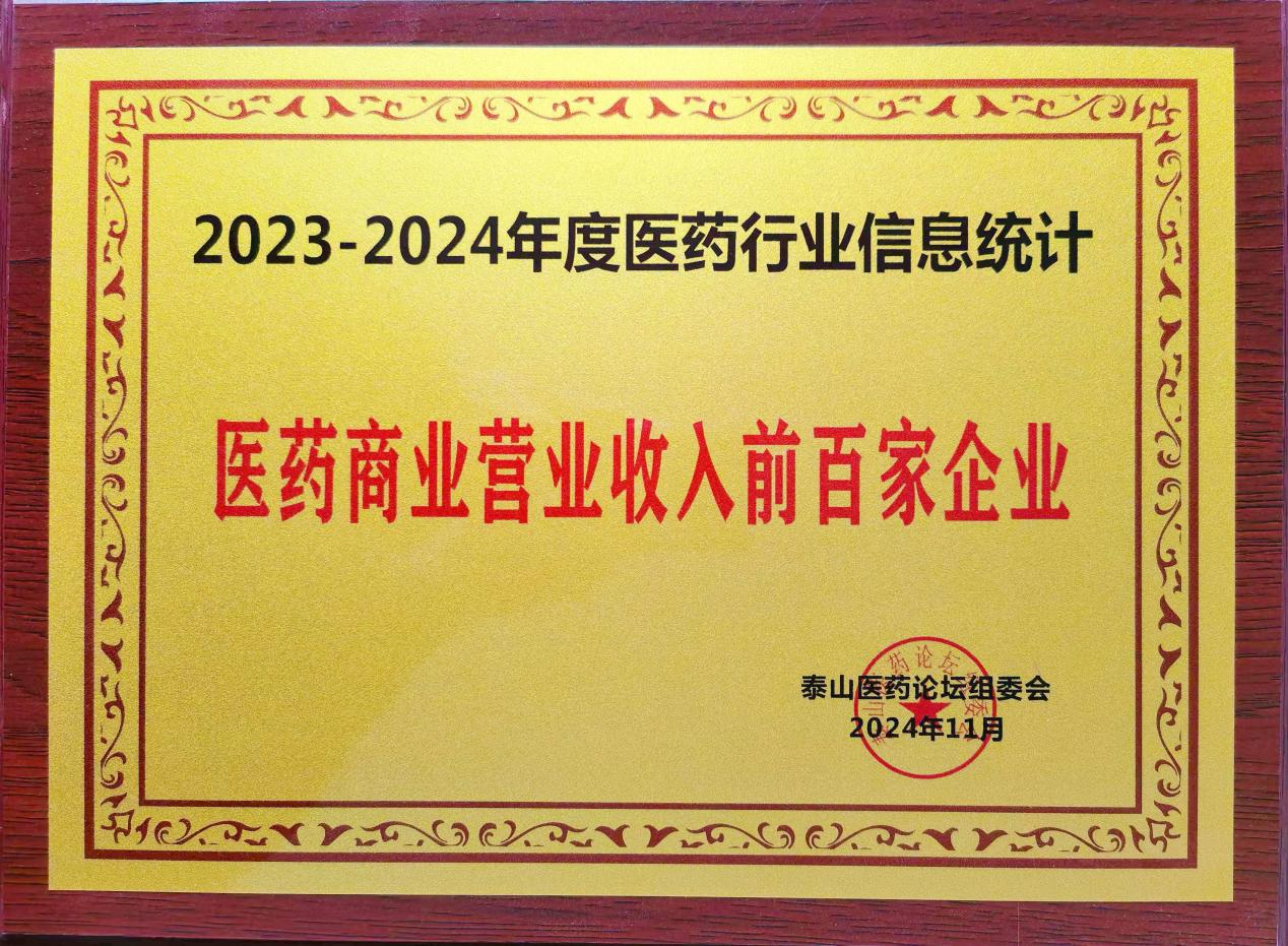 2024年11月4日由中國工商聯(lián)合會醫(yī)藥業(yè)分會主辦的《第三屆泰山醫(yī)藥論壇》在山東省濟南市開幕,此次論壇舉辦了“2023年度中國醫(yī)藥行業(yè)信息發(fā)布會”,信息發(fā)布會上舉行了頒獎儀式,授予五洲醫(yī)藥“2023-2024年度醫(yī)藥商業(yè)營業(yè)收入前百家企業(yè)”、“2023-2024年度醫(yī)藥行業(yè)守法誠信企業(yè)”榮譽稱號。